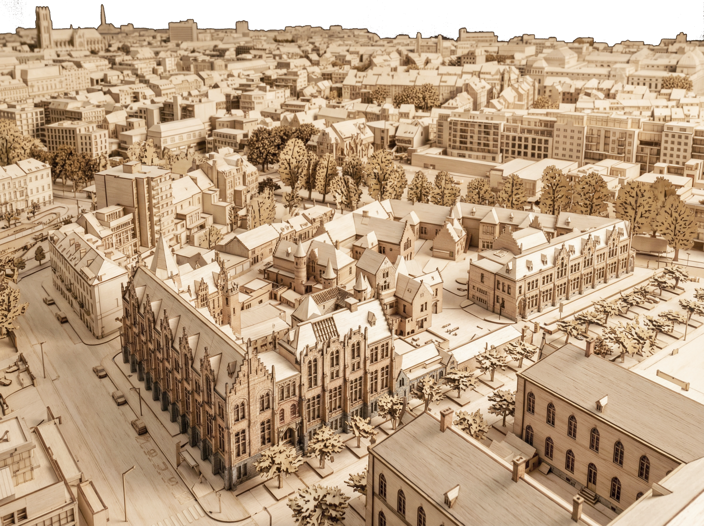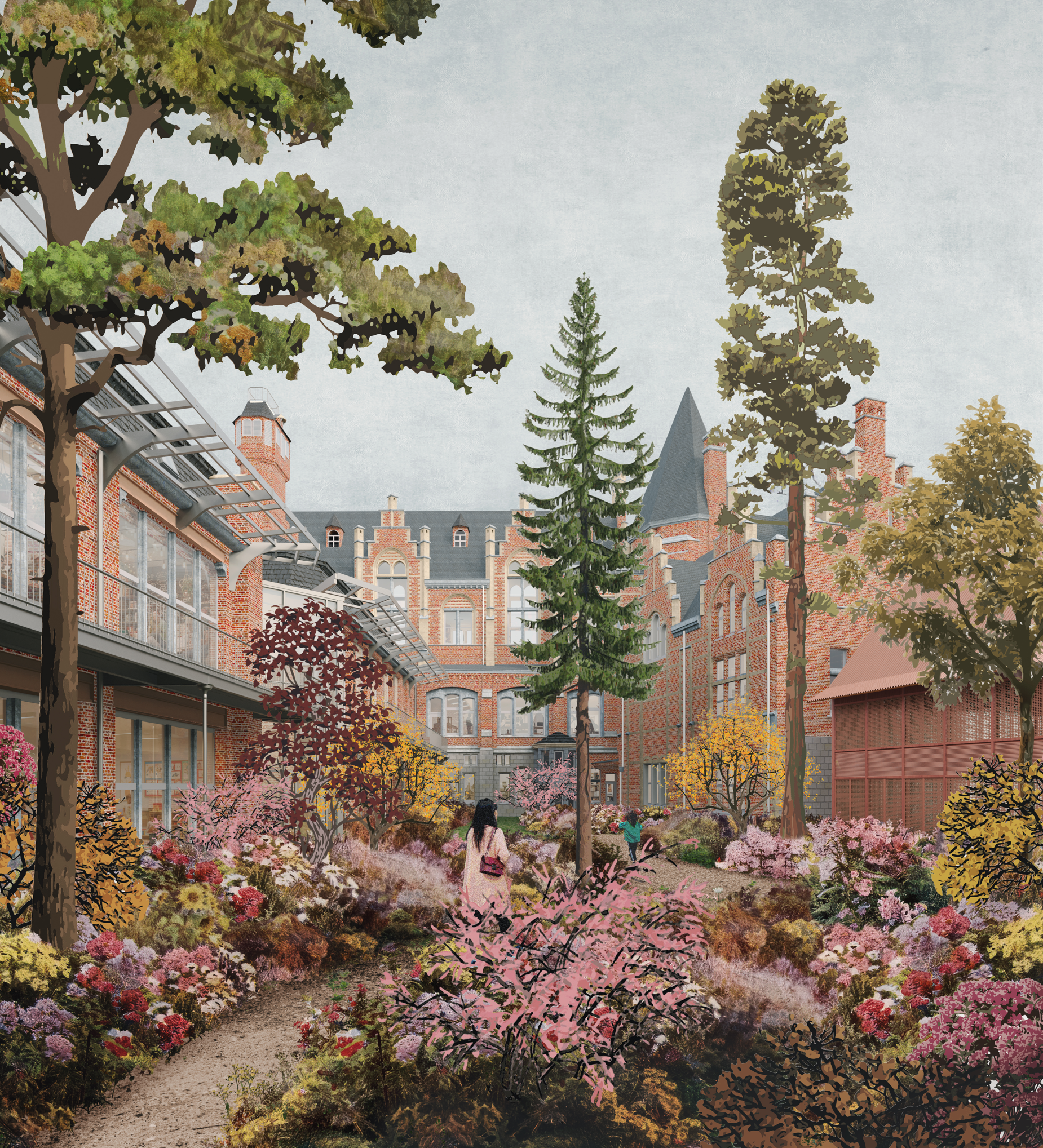 De neogotische architectuur van Louis Cloquet vormt het dragende kader van het project. De restauratie vertrekt vanuit zorg, aandacht en respect voor het bestaande, in nauwe dialoog met erfgoedinstanties, gebruikers en stad. Nieuwe ingrepen zijn leesbaar, omkeerbaar en beperkt tot plaatsen waar ze historisch logisch zijn. Zo wordt erfgoed geen bevroren monument, maar een actief onderdeel van het hedendaagse stadsleven.