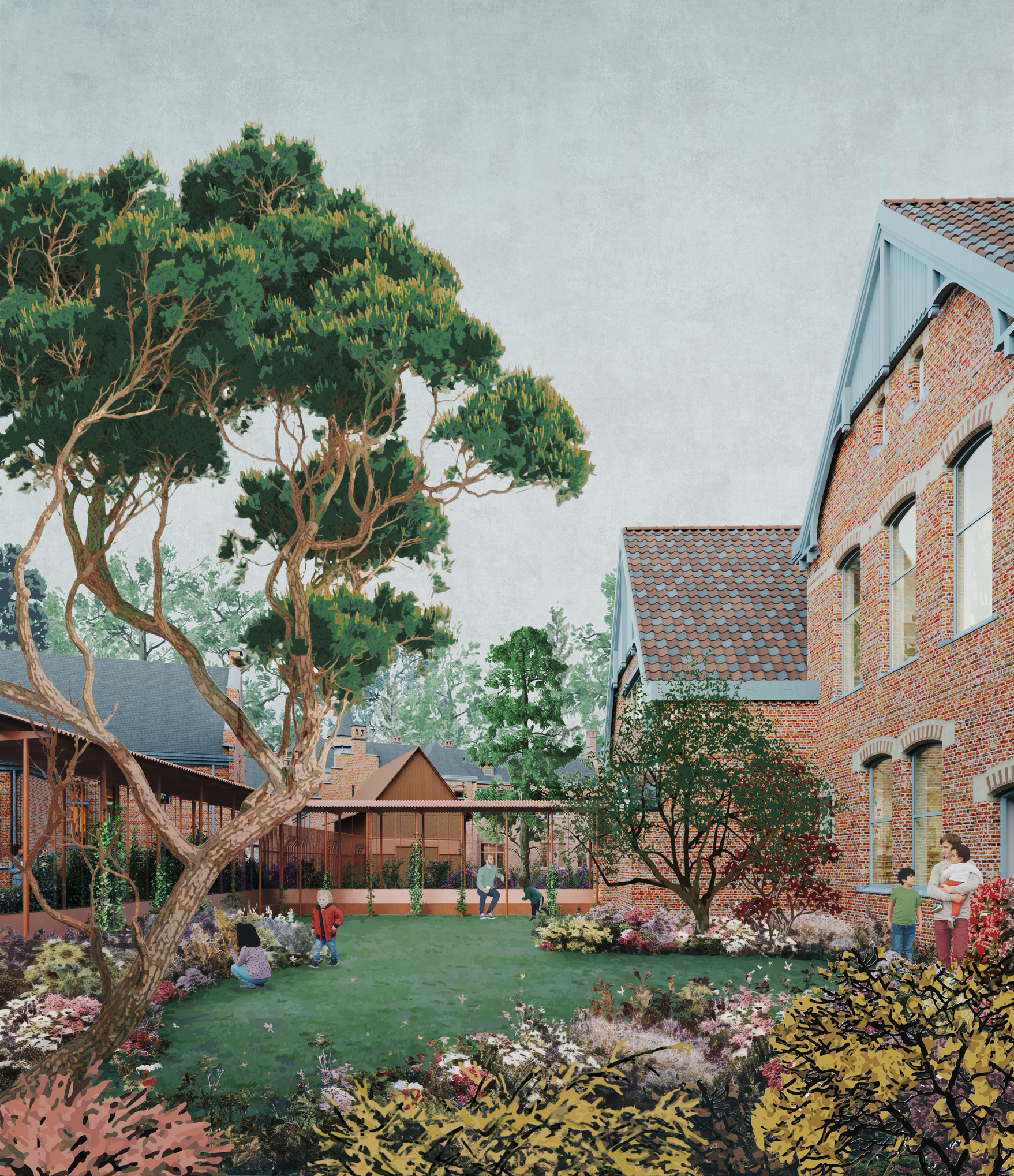 Centraal op de site ligt Cornucopia, een groene binnentuin (Jan Minne) die rust en verbondenheid brengt in de stad. De tuin is tegelijk plek voor spel, ontmoeting en vertraging, en vormt het sociale en ecologische hart van het project. Hij maakt seizoenen zichtbaar en biedt ruimte aan informele uitwisseling, zorg en collectieve ervaring.