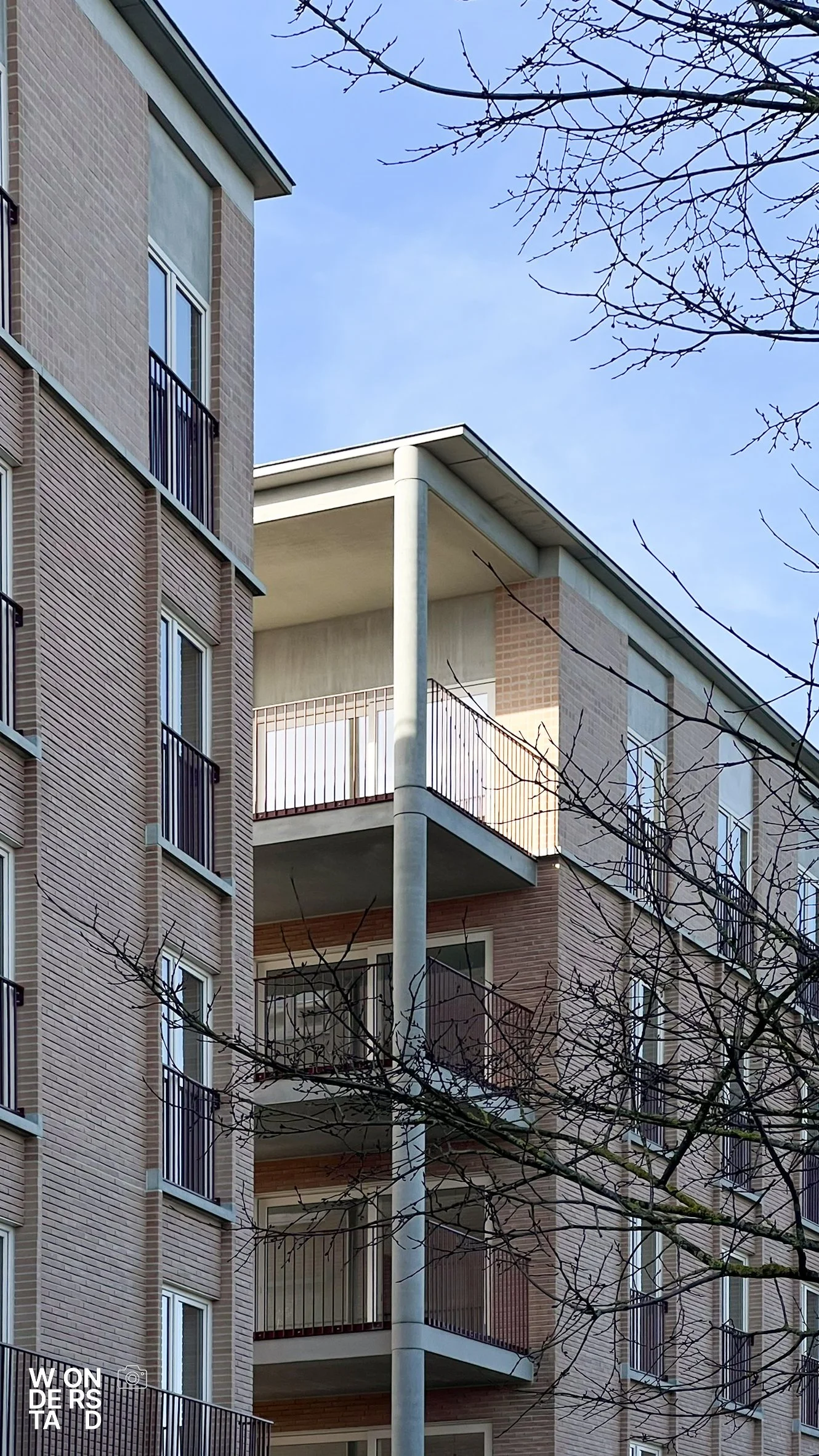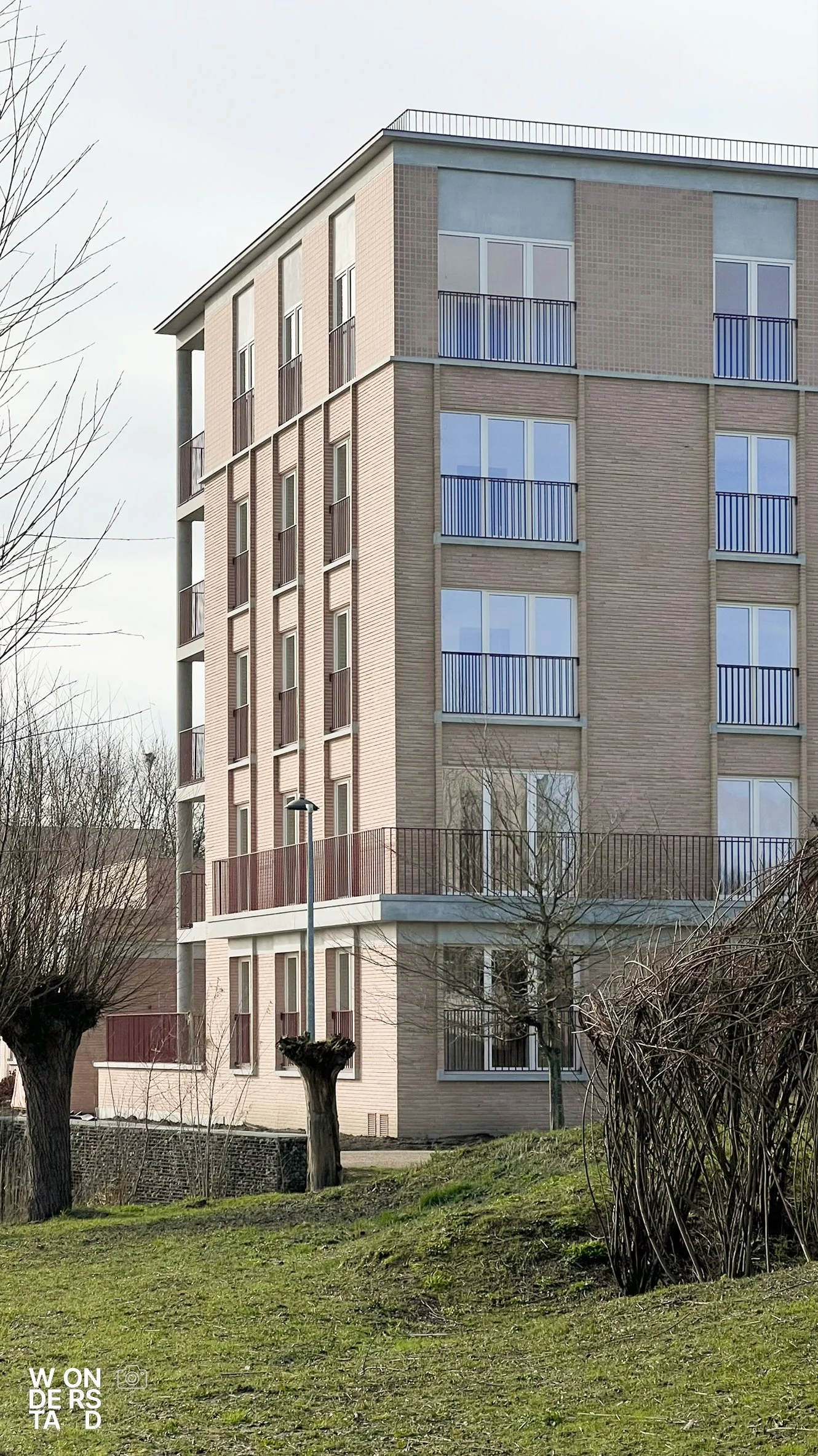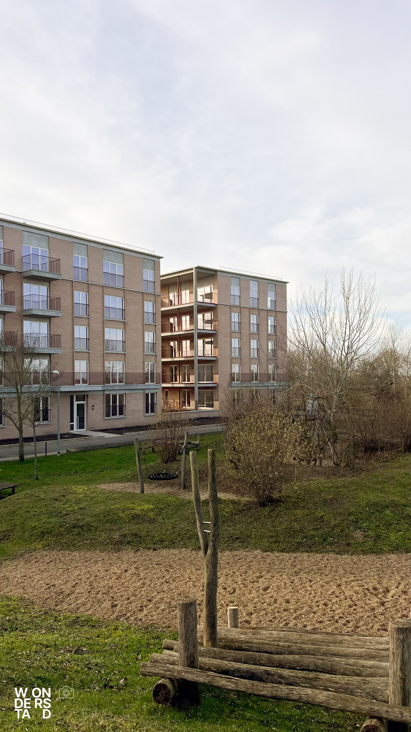 Een verhoogde sokkel tilt de appartementen boven het maaiveld. Dit geeft het gebouw niet alleen allure als ensemble, maar creëert ook een natuurlijke buffer voor privacy.