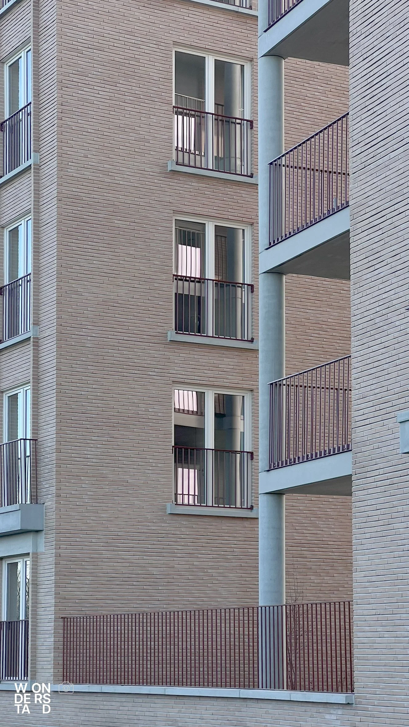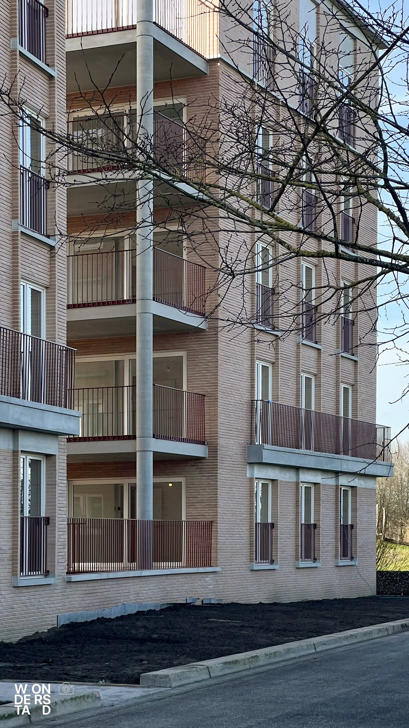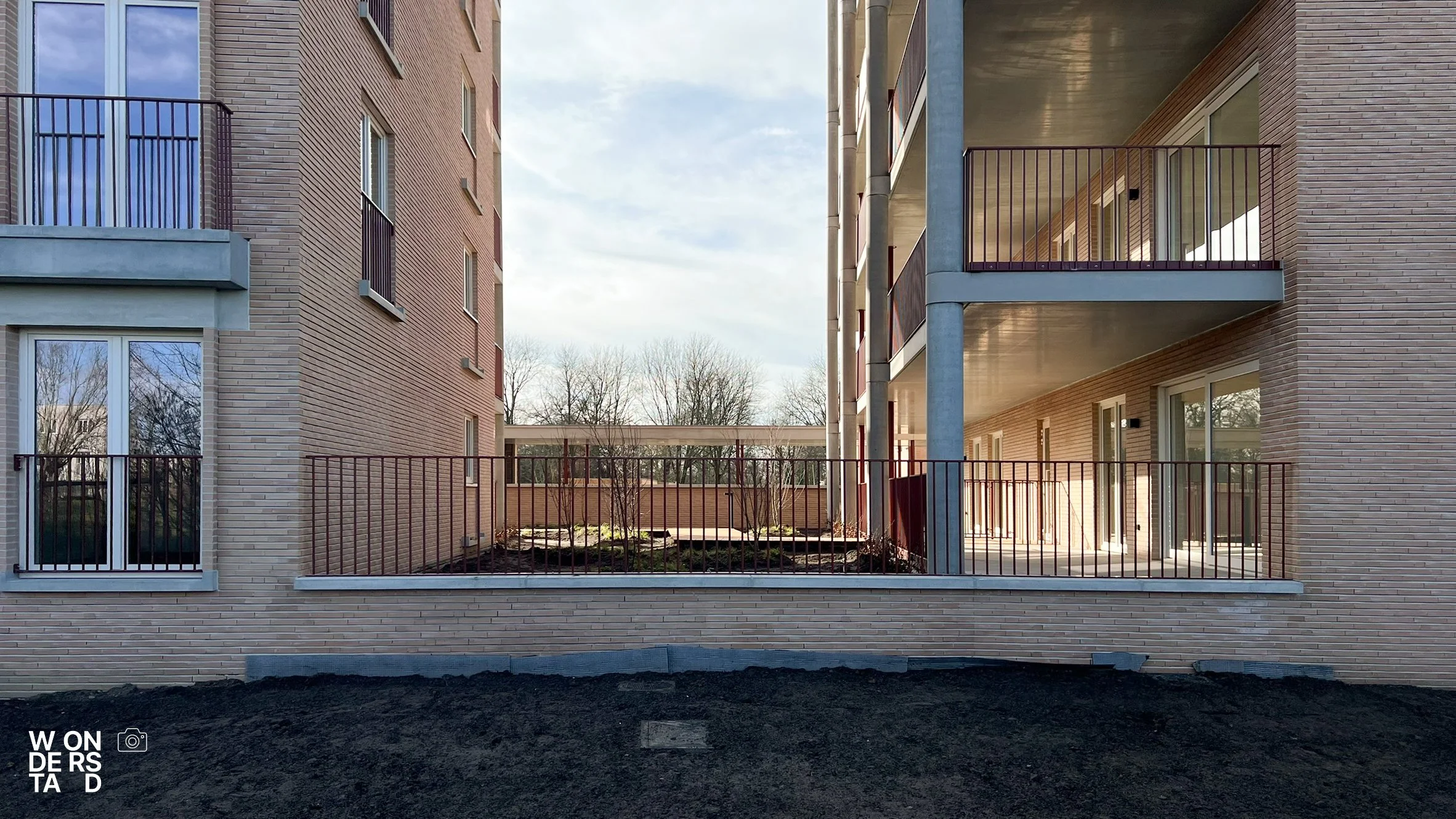 Om de menselijke schaal te waarborgen en de gevels tactiliteit te geven, werken we met verfijnde metselwerkverbanden. Deze subtiele variaties in textuur doorbreken de vlakken en geven de gebouwen een rijk en gelaagd karakter. Een dergelijk ontwerp staat of valt met de uitvoering. Dankzij de expertise van aannemer Furnibo wordt dit metselwerk met de hoogste perfectie gerealiseerd. Hun oog voor detail zorgt ervoor dat het ontwerpidee naadloos vertaald wordt naar de werf.