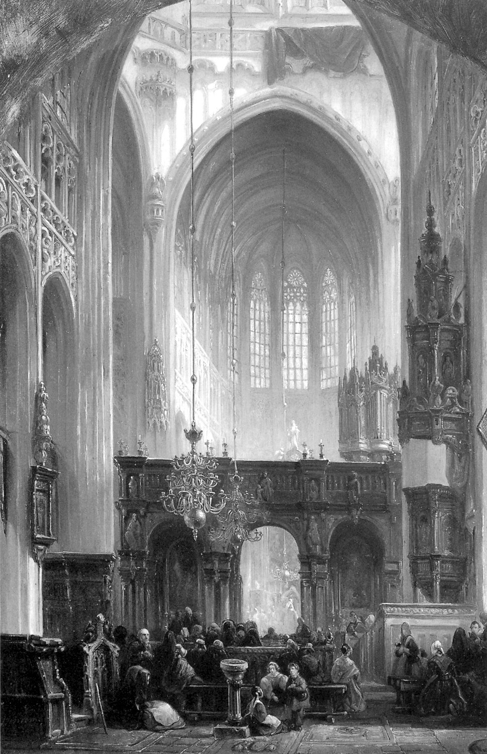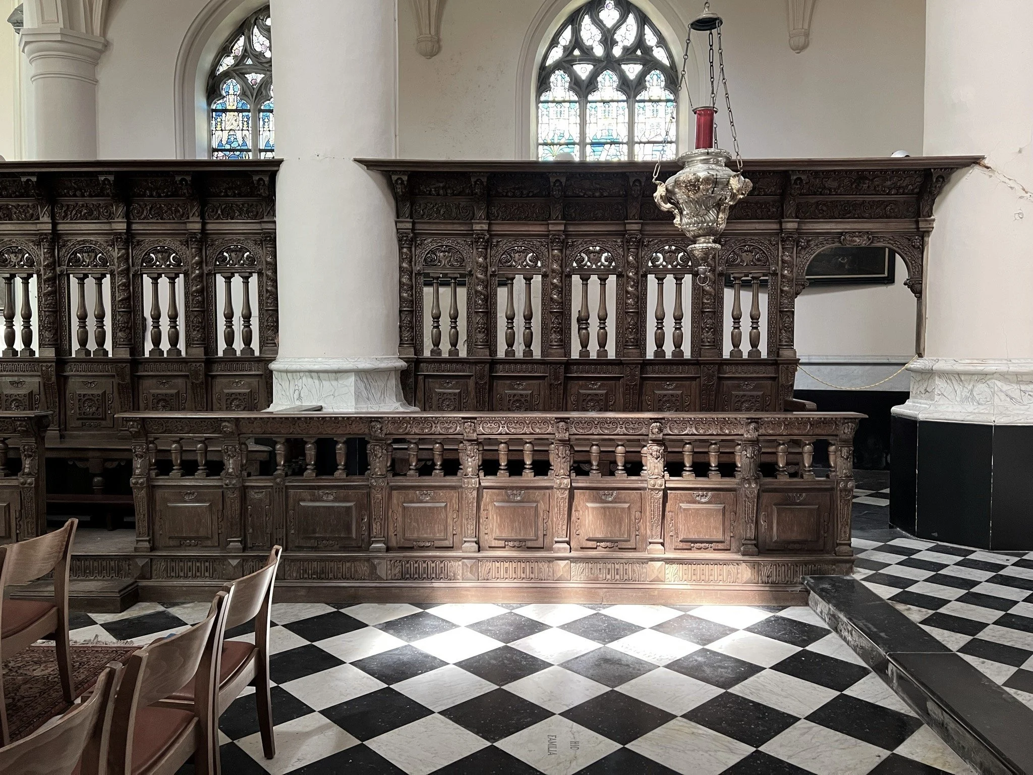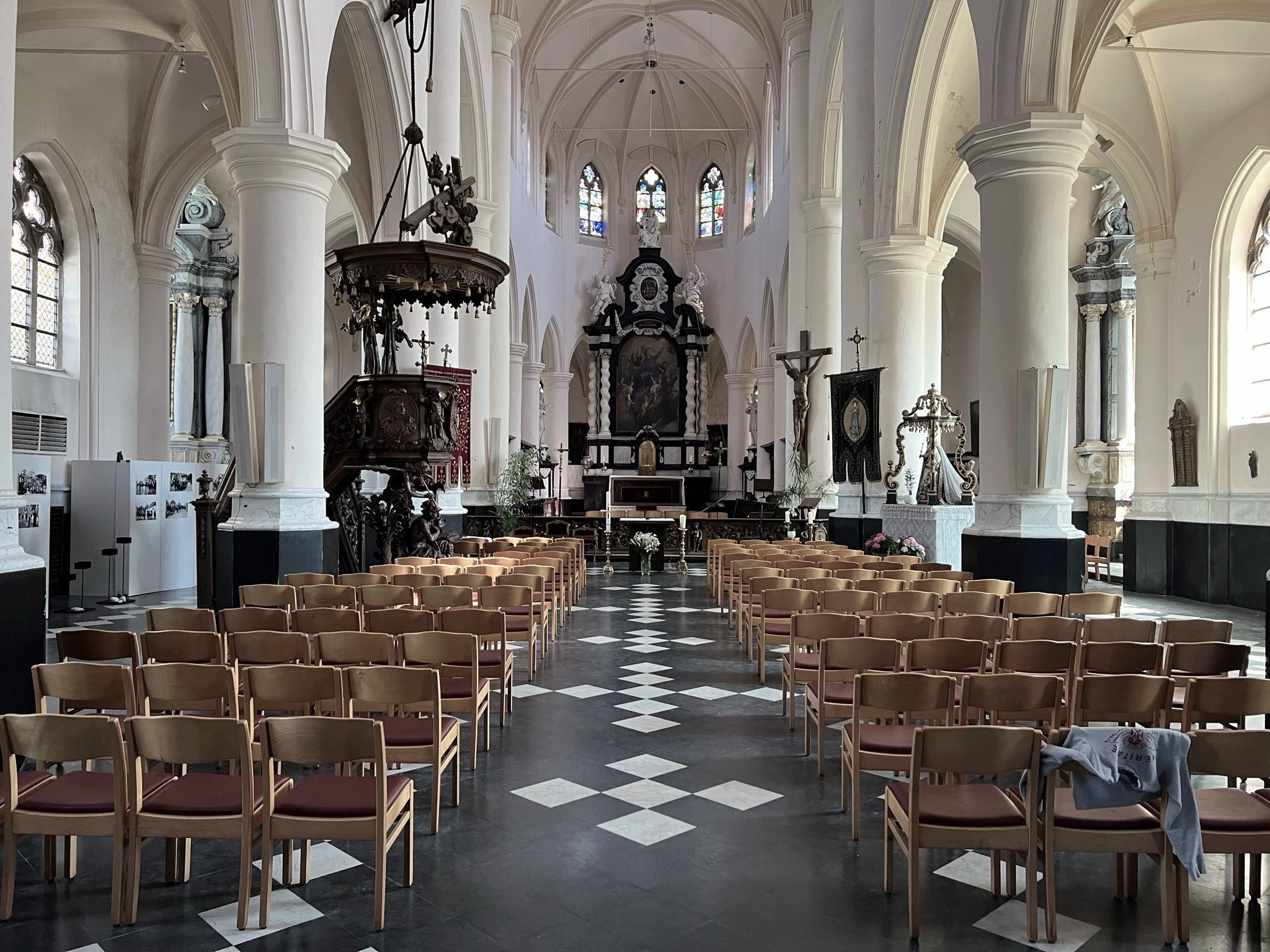 Tegelijkertijd zijn de architectuur en ruimtelijkheid krachtig genoeg om een complementaire beleving toe te laten.De kerk kent een interieur met een rijk palet aan waardevolle, karakteristieke en terugkerende elementen: donkergetinte houten meubelelementen (orgel, preekstoel, biechtstoelen, koorbanken, etc) op een zwarte vloer, tegenover een witte pleisterwerk achtergrond.