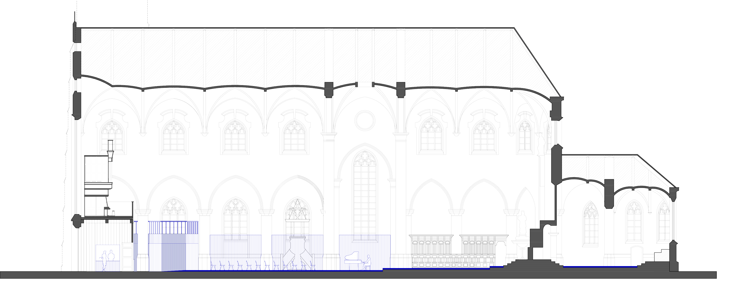 Langs weerszijden van het oksaal bij het binnenkomen van de kerk liggen momenteel twee ruimtes, uitlopers van de zijbeuken, die minder gebruikt worden door hun hoekpositie in de totale ruimte van de kerk. Hierdoor missen ze kansen. Het zijn zones in de luwte die nu een beetje onhandig gebruikt worden als doorloopruimte en stockageplaats voor stoelen, beelden en ander los materiaal. Geen van beide ruimtes kunnen volwaardig worden ingezet voor de beleving van de kerk, maar daar ligt net hun potentie en cruciale rol.