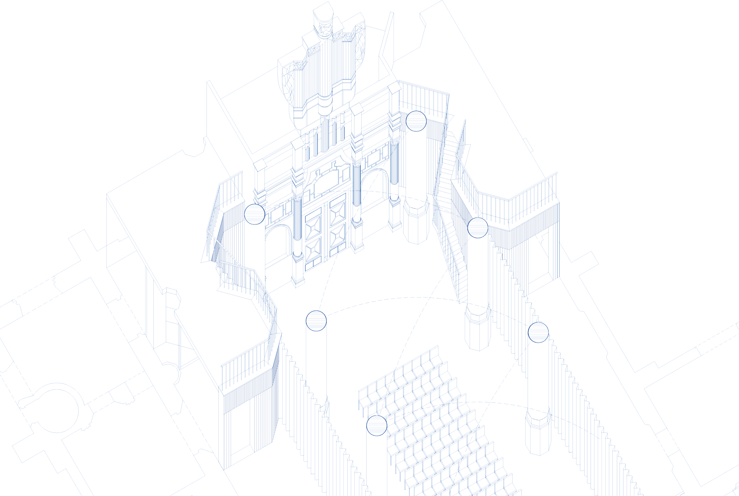 Het monumentale orgel krijgt twee functionele vleugels met anti-chambres met twee extra balkons bovenop. De vleugels zelf worden bijkomend ingezet als gordijnkasten. Zo kunnen de gordijnen belangrijke akoestische verbetering bieden bij een tentoonstelling of lezing, maar kunnen ze ook terug weggeborgen worden in geval van een orgelconcerto, een moment waar de gordijnen eigenlijk niet gewenst zijn.