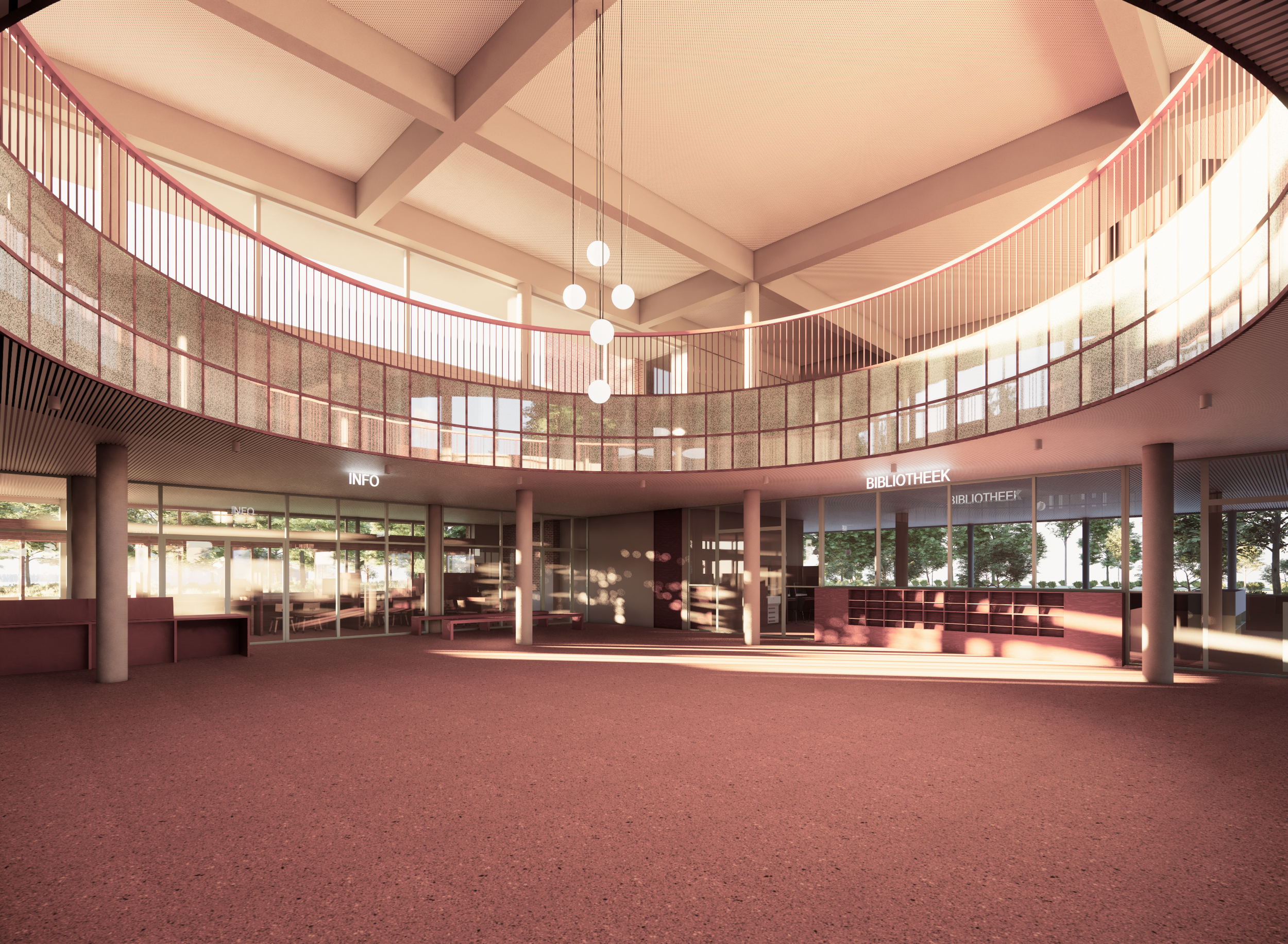 Het ruimtelijke hart van het ontwerp bevindt zich centraal op het gelijkvloers: het 'Forum'. Deze dubbelhoge ruimte fungeert als de spil waar diverse functies samenkomen. De open indeling verbindt het leescafé, de balie van de bibliotheek, de burgerloketten en de foyer voor de theaterzaal en polyvalente ruimtes naadloos met elkaar. Ook de theaterbar krijgt hier zijn plek, wat bijdraagt aan een levendige circulatie.