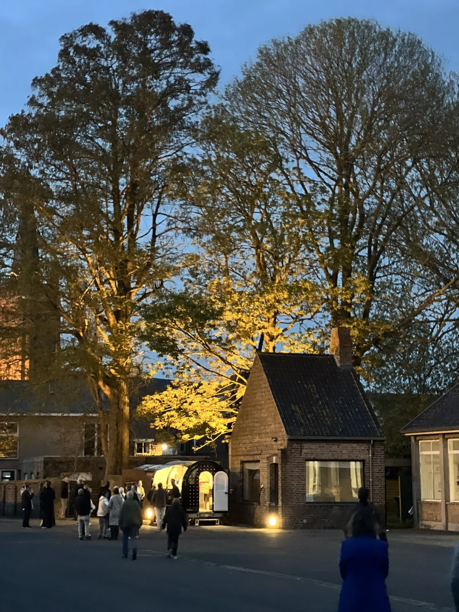 Wanneer de avond valt, transformeert het gebouw. De architectuur werkt als een lantaarn: een warm, gloeiend baken dat veiligheid en gezelligheid uitstraalt over het park. Als een vuurtoren in een groene zee nodigt het licht je uit om dichterbij te komen, om samen te komen en verhalen te delen. Het is het symbool van een open huis dat nooit slaapt en altijd klaarstaat voor zijn bewoners.