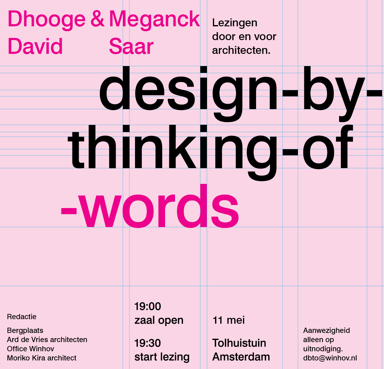 Lezing in de Tolhuistuin, Amsterdam, in de reeks ‘design-by-thinking-of...’. ‘Design-by-thinking-of’ is een reeks lezingen op uitnodiging, door en voor architecten. Het biedt architecten een nieuw platform om hun projecten en specifieke ideeën over design te delen. Redactieraad: Bergplaats, Ard de Vries Architects, Office Winhov en Moriko Kira Architect.