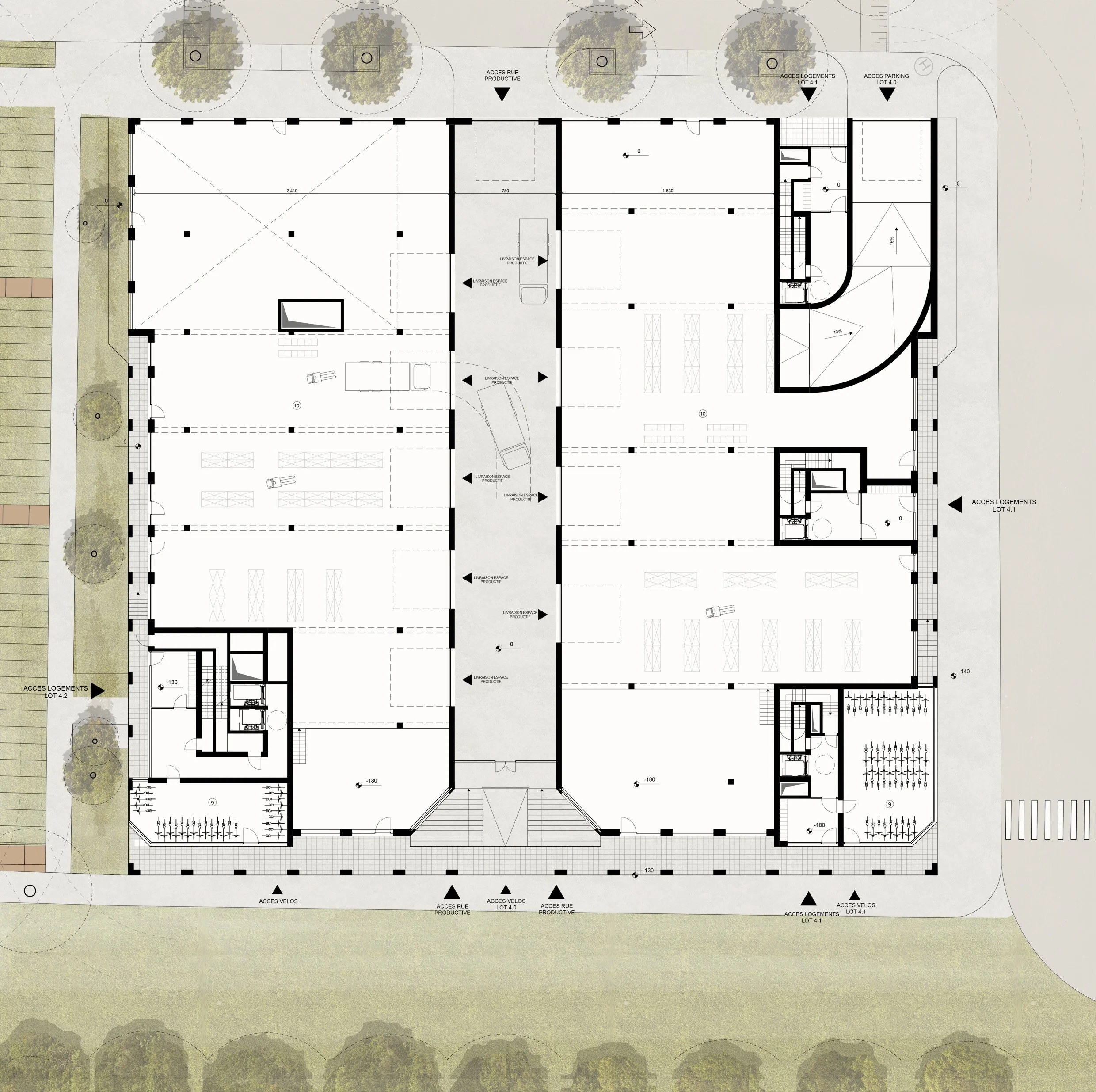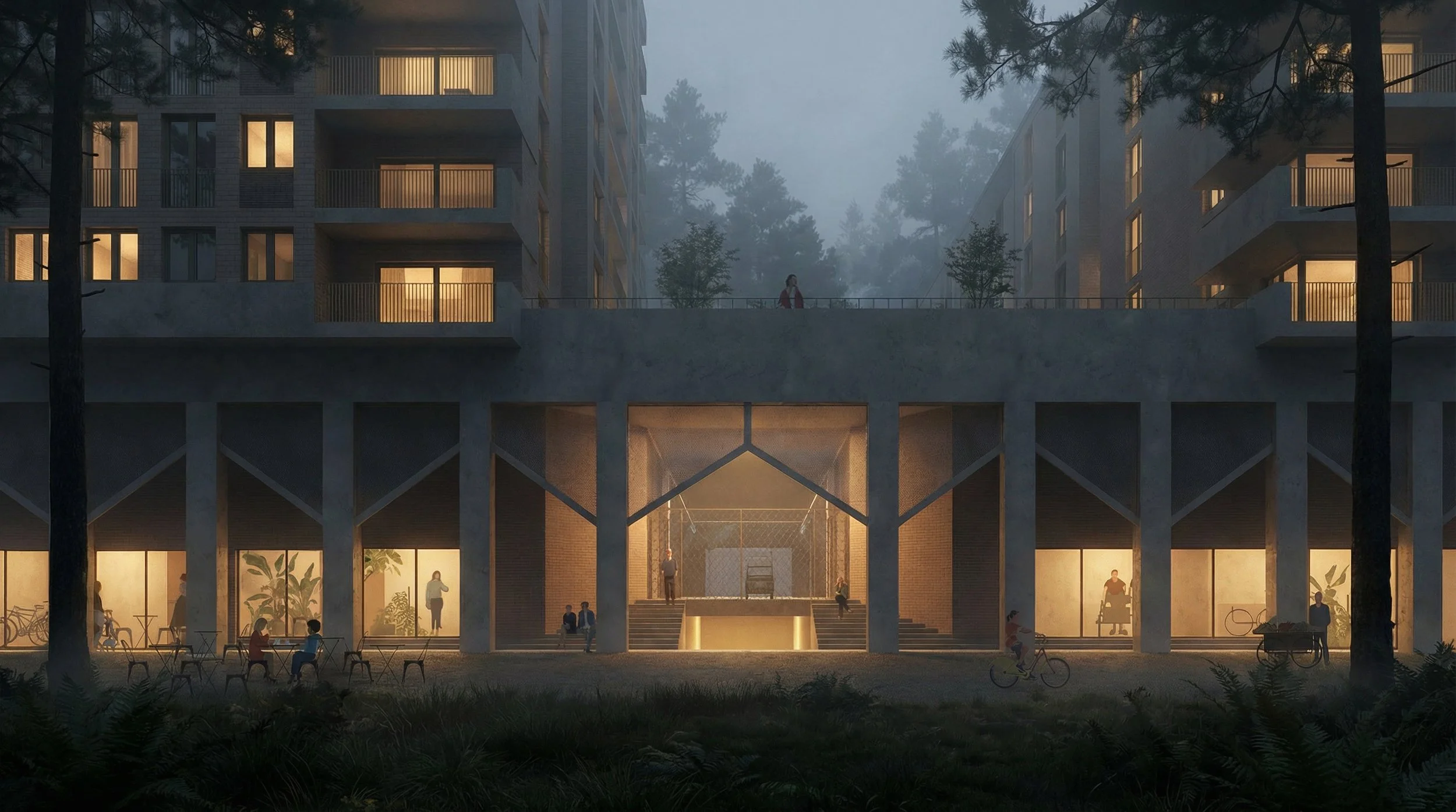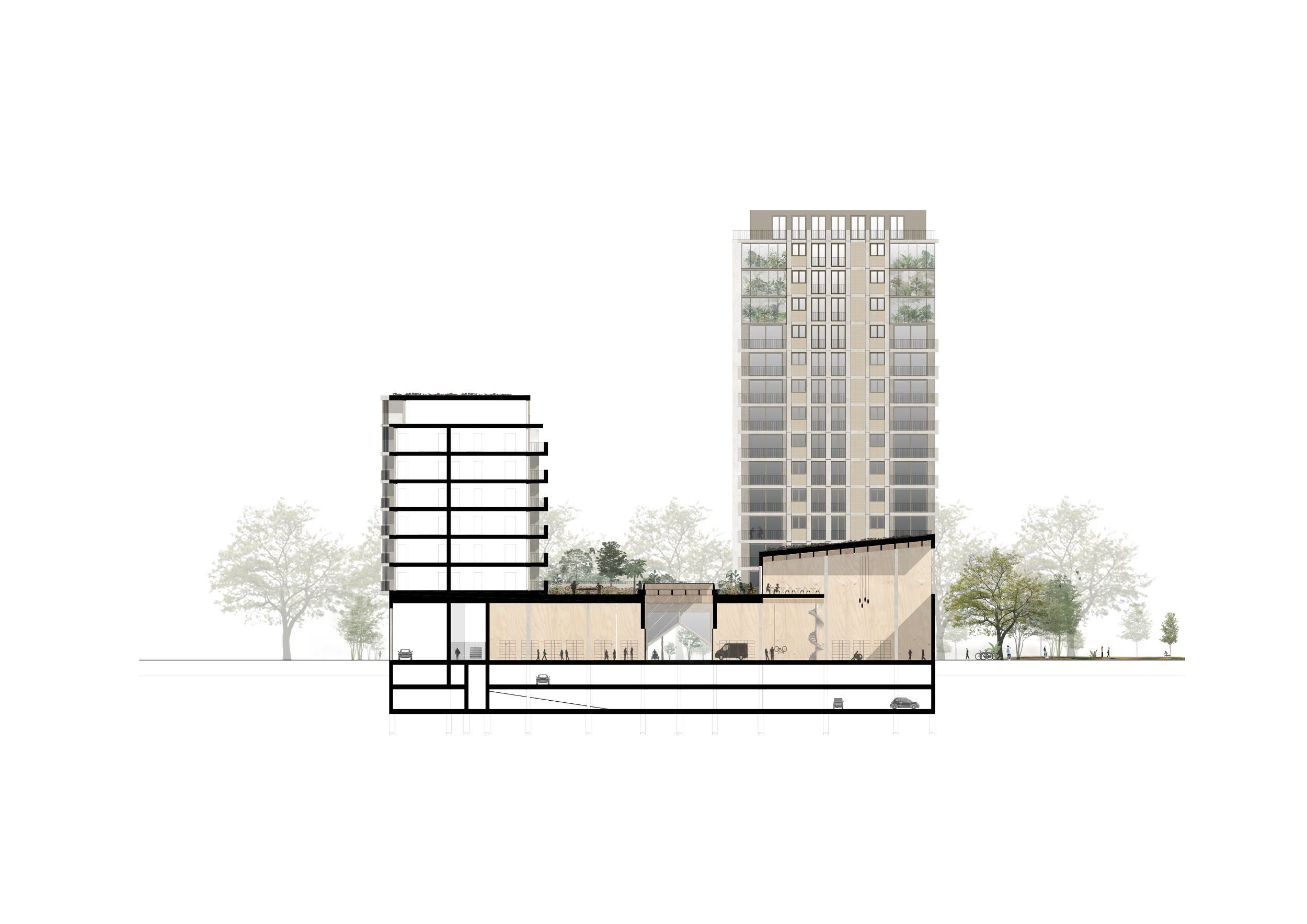Binnen de deelsites wordt een uitgewerkt architecturaal voorstel ontwikkeld waarin wonen wordt gecombineerd met kleinschalige productieve activiteiten en maakindustrie, aangevuld met collectieve en sportieve voorzieningen. Deze programmatische verweving draagt bij aan een levendige en veerkrachtige stadsomgeving die inzet op dagelijks gebruik, lokale economie en gedeelde infrastructuur.
